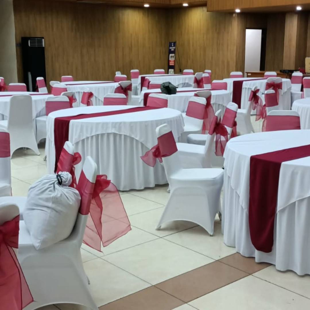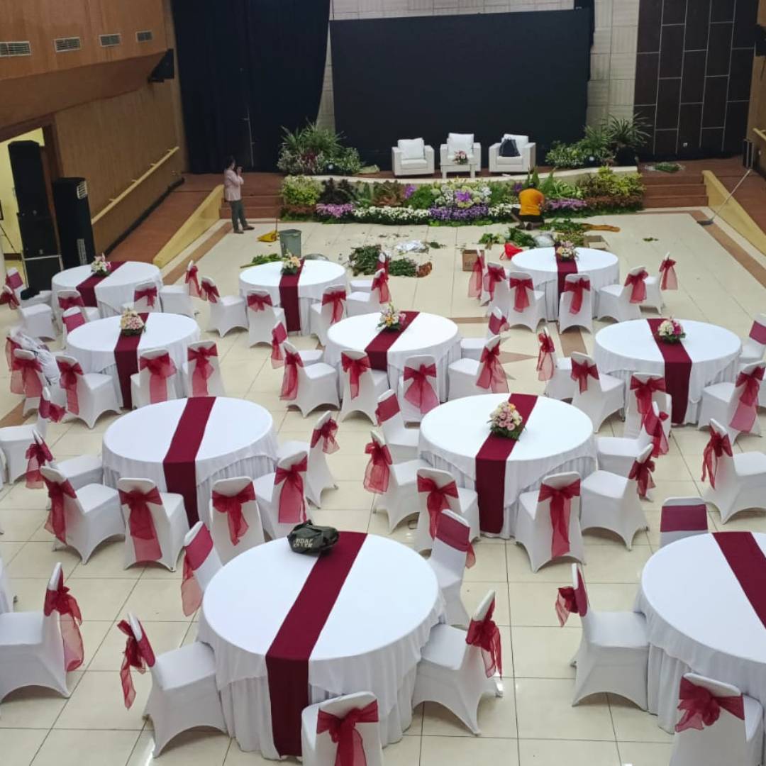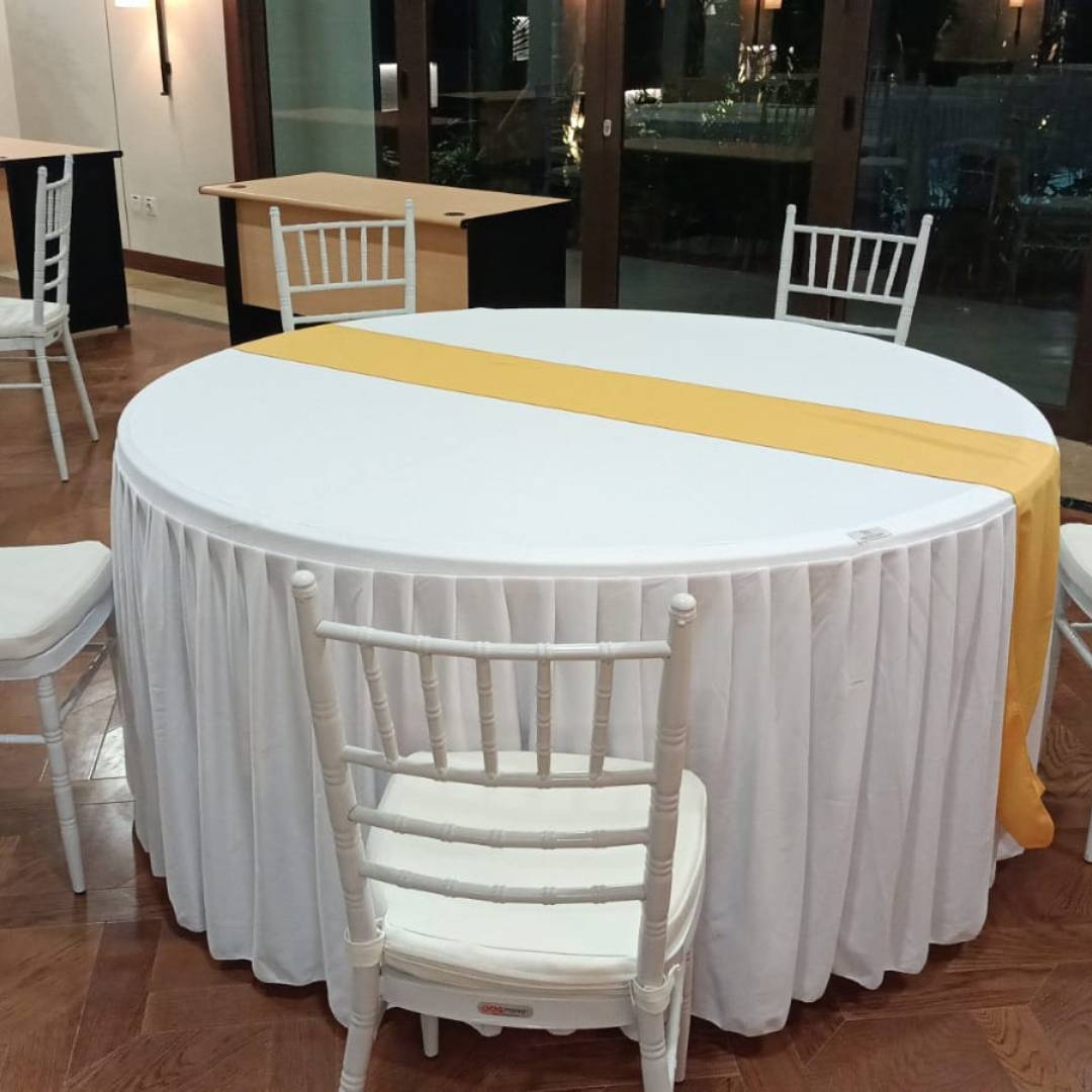 Sewa meja bulat diameter 160 bisa buat kursi 10 atau lebih berbahan kualitas dari krisbow covernya juga berkualitas dari bahan lotto cocok untuk event anda.